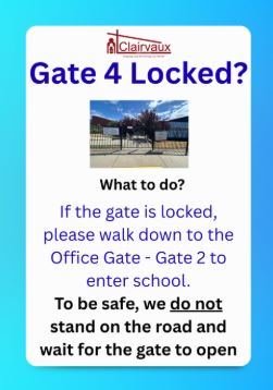 We recognise that Gate 4 (Plaza drop off zone) can be the most challenging if the gate is not open on time. We have created a sign and will explain to our students that if this gate is not open on time they need to walk down the path to Gate 2 (Office gate) and enter the school from there.