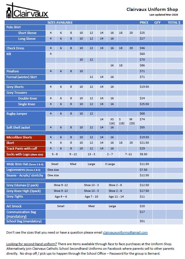 Clairvaux has a very tidy and functional uniform. Wearing a school uniform has many benefits and is an expectation of our community. We would appreciate families reading the policy linked below and taking the time to ensure all students are in their full appropriate uniform. This includes hair accessories, no jewellery except for small studs or sleeper earrings, no leggings or tights with the summer dress and no nail polish.