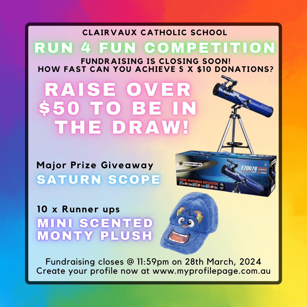What would your family buy with a $10,000?! The highest fundraising student in our school will go into the draw to win: $2,500 Coles Card, $2,500 Woolworths Fuel Card, $2,500 Harvey Norman Card and a $2,500 Visa Card.