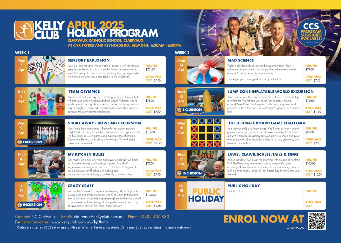 | 2026 Wednesday 28th January - Year 1-6 Students Begin Wednesday 28th January - Prep testing Thursday 29th January - Prep testing Friday 30th January - Preps begin Wednesday 4th Feb - No school for Preps Wednesday 11th Feb - No school for Preps Monday 16th Feb - Clairvaux Cross Country Yr 4-6 Wednesday 18th Feb - No school for Preps Wednesday 25th Feb - No school for Preps Monday 2nd March - Preps begin full weeks at school Monday 2nd March - Clairvaux Senior Athletics Yr 4-6 Monday 9th March - Public Holiday Tuesday 10th March - School Closure Day Tuesday 10th March - Division Swimmming - selected students Monday 16th March - Year 6 camp (2 nights) Tuesday 17th March - Year 6 camp Wednesday 18th March - Year 6 camp Thursday 19th March - Yr 6 students no school Tuesday 24th March - Colour Run (evening) Friday 27th March - Yr 6 Summer Lightning Prem Thursday 2nd April - Last day of term 1 2:30 dismissal Monday 20th April - First Day of Term 2 Friday 24th April - City to Surf Cross Country - selected students Monday May 4th - Swimming begins for Yr 3 and 4 (all week) Monday May 11th - Swimming begins for Yr 1 and 2 Tuesday 19th May - Division cross country - selected students Friday 29th May - Yr 6 Winter Lightning Prem Monday 8th June - Public Holiday Tuesday 9th June - Year 5 Camp (one night) Wednesday 10th June - Year 5 camp Thursday 11th June - Yr 5 students no school Friday 26th June - Last Day of term 2 |